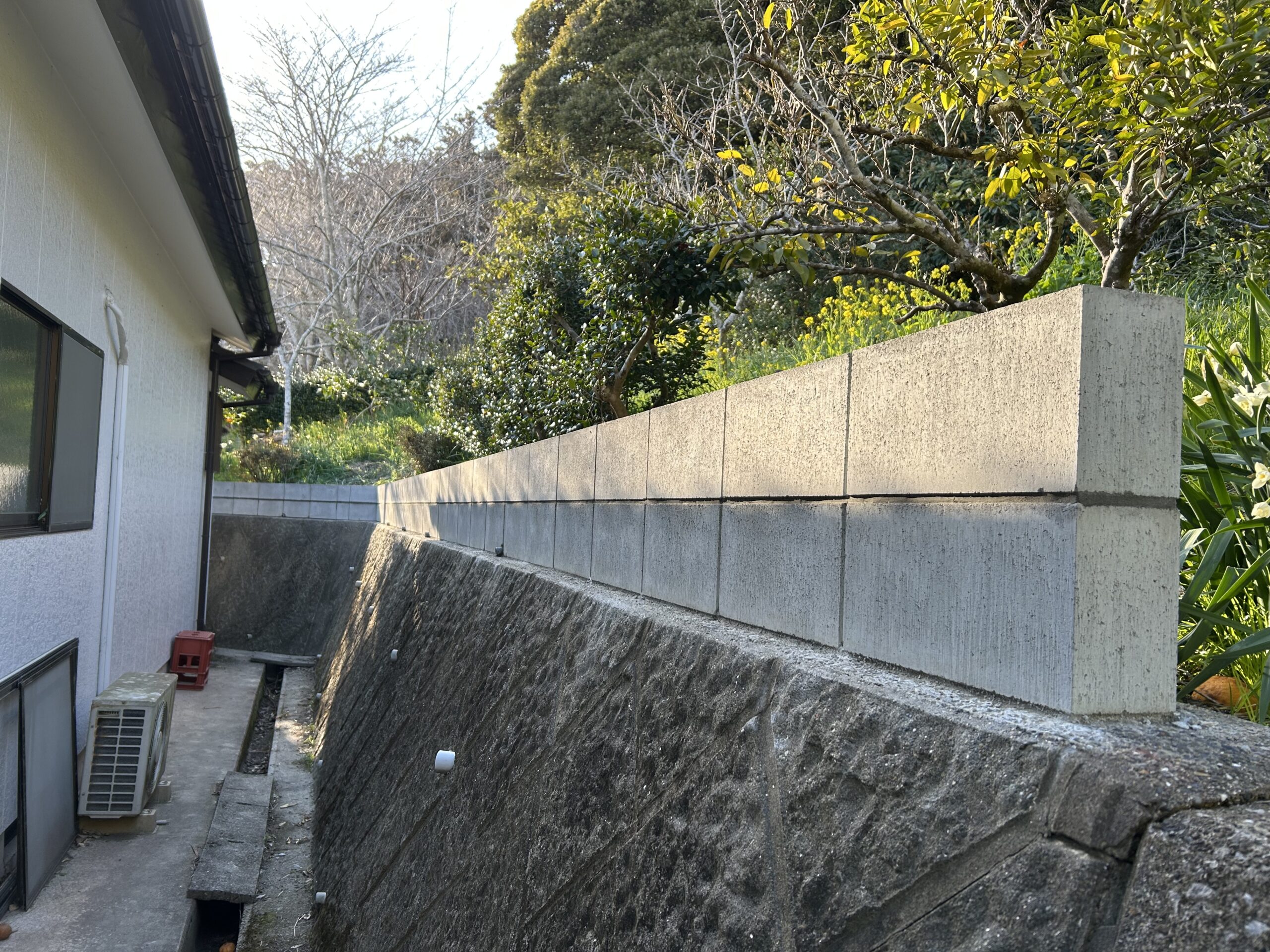 雨が降ると土が流れてきてしまうとご相談をいただき、土留めブロックの施工を行いました。